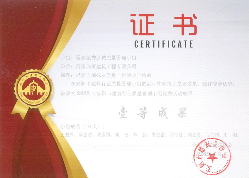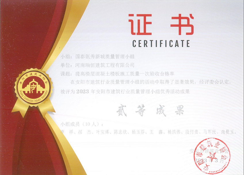 近日,公司國(guó)泰瓴秀新城項(xiàng)目申報(bào)的《提高樓層混凝土樓板施工質(zhì)量一次驗(yàn)收合格率》和《提高內(nèi)墻抹灰質(zhì)量一次驗(yàn)收合格率》兩項(xiàng)QC成果榮獲2023年度安陽(yáng)市建筑行業(yè)質(zhì)量管理小組優(yōu)秀活動(dòng)成果。